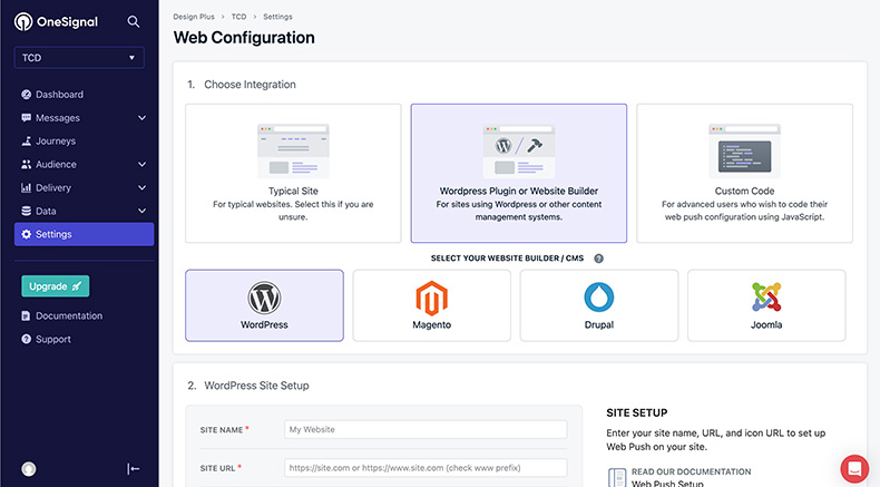 ↑「2. WordPress Site Setup」でサイト名、サイトURL、サイトのファビコン等を登録できたら、下部の「Push Slide Prompt」をクリックしてください。