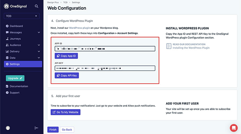 保存できたら、上記画面に「APP ID」と「APP KEY」が表示されます。後で使うので、両方ともコピーしてどこかに保存しておきましょう。コピーできたら、「Finish」を押して完了です。