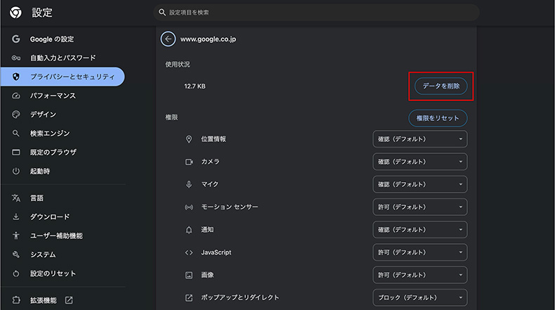 次の画面が開きますので、「データを削除」からデータとクッキーを削除可能です。