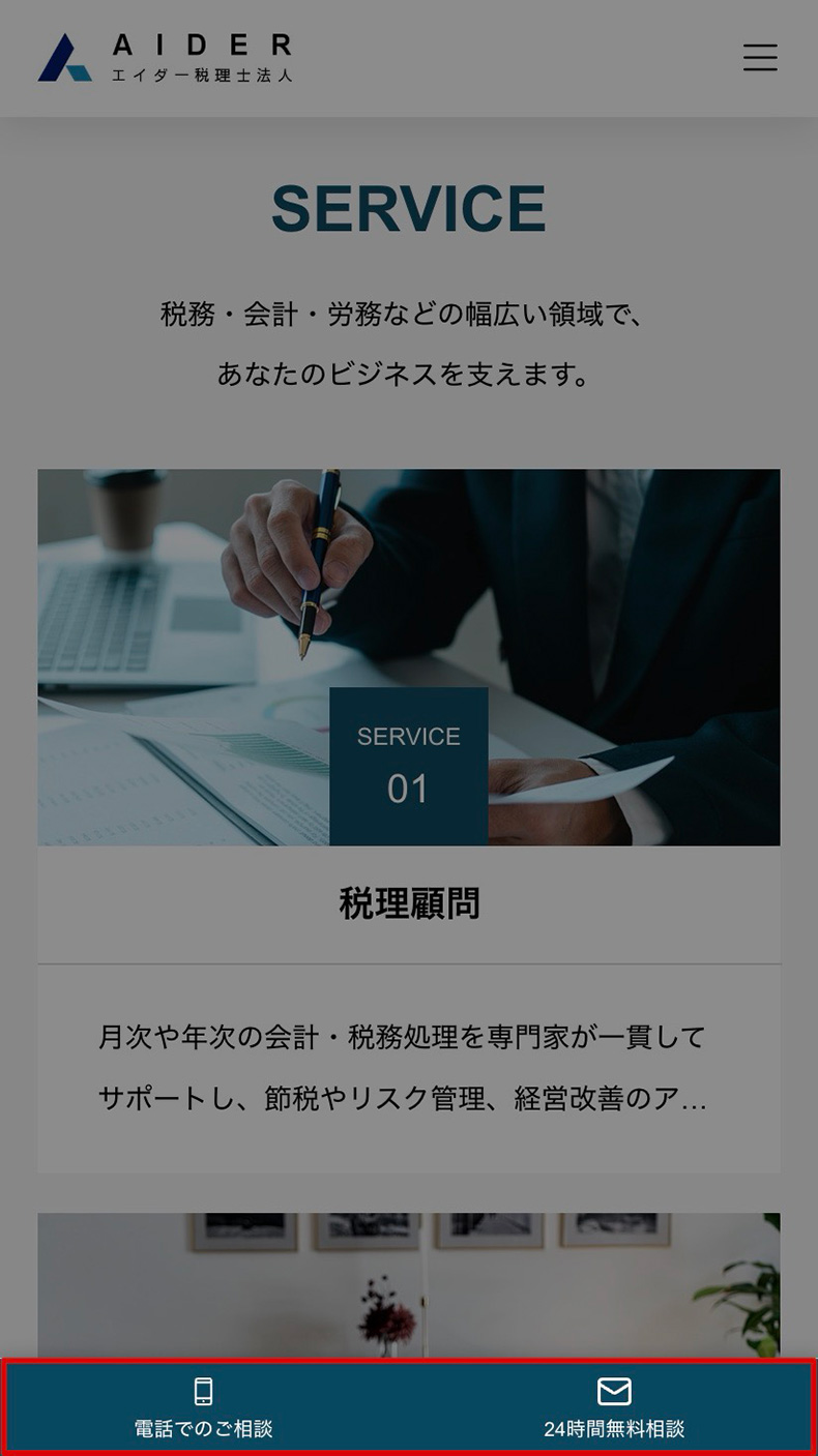 税理士事務所で展開するサービスが一覧表示されるので、訪問者をスムーズに案内できます。ここには画像・テキスト・URLを任意の数だけ登録できるので、サイト内のナビゲーションとしてはもちろん、外部ページへのリンクも登録可能です。