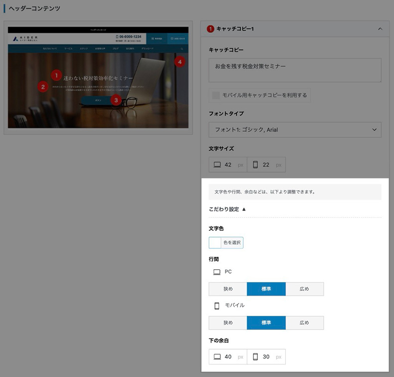 キャッチコピーのフォントサイズによって、行間は大きく変わります。そこをPC・スマホ別で調整できるようにしました。美しい見せ方にこだわる方に向けたオプションです。
