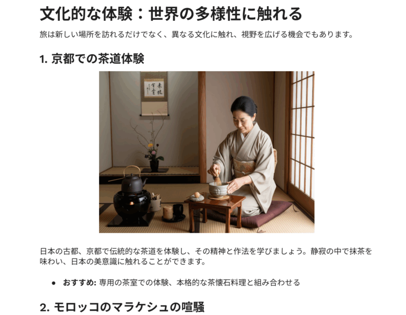 実際の生成画面の一部。見出し付きの文章に加え、関連する画像まで自動で挿入された。