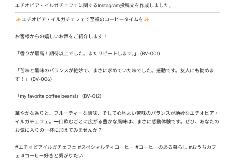 例えば、筆者が架空のコーヒー通販「BeanVibe」の売上・顧客フィードバックデータを用意し、「この表からポジティブなフィードバックを抜き出してSNS用の文章を作って」と依頼したところ、以下のようなInstagram投稿文とハッシュタグが生成されました。