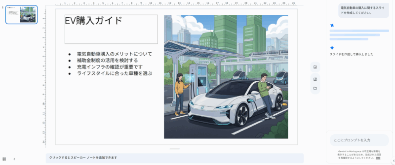 「EV購入に関するスライドを作成して」と依頼した例。完成度はまだ高くない。