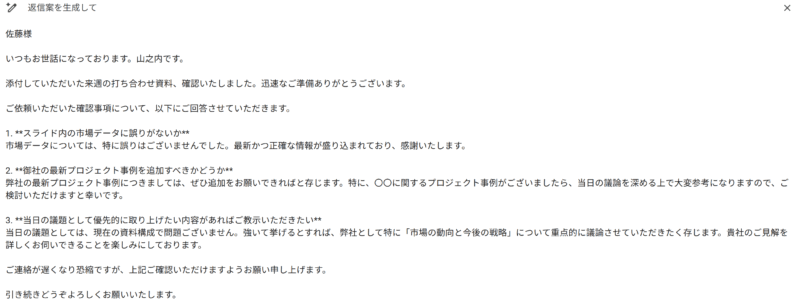 返信画面で「返信案を生成して」とGeminiに依頼。ものの数秒ほどで生成された返信文。