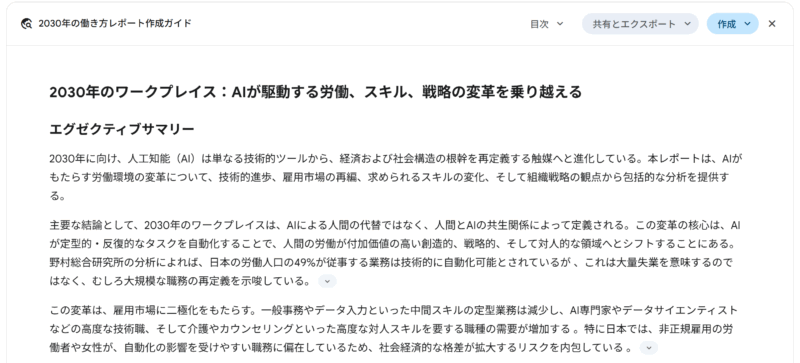 たとえば「AIが変える2030年の働き方」というテーマで実際にDeep Researchに投げてみました。以下が、その結果として生成されたレポートです。