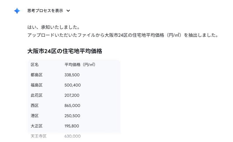 また、ライターという仕事柄、行政などが公表しているデータをAIに分析・抽出させることも多いのですが、これもFlashでは誤りが目立ち、実務には耐えません。一方でProなら必要な情報を正確に拾い出してくれるため、記事制作に活かせるレベルのアウトプットが得られます。