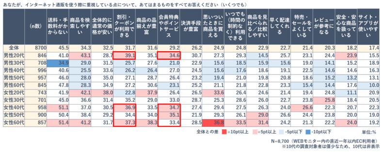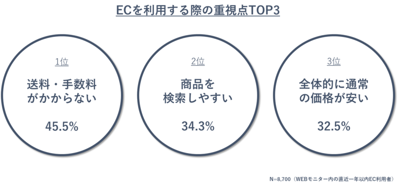 HAKUHODO EC+が実施した「EC生活者調査」では、送料・手数料がかからない点を重視するユーザーがもっとも多いことが明らかになっています。