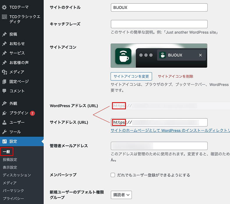 「設定 > 一般」で「WordPressアドレス」と「サイトアドレス」が一致するように、httpsへ統一します。