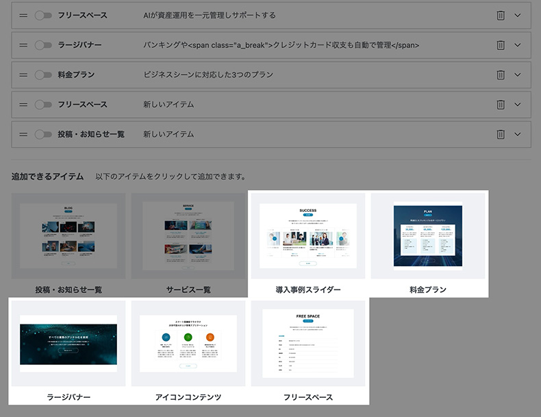 BLAZEなら、カスタム投稿「導入事例」で作成した内容をトップページにそのまま掲載できます。もちろん設置場所は自由に変更可能です。