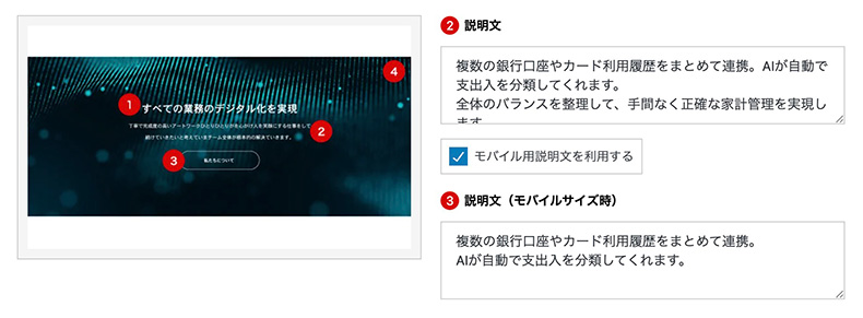 各アイテムごとにPC、モバイル別でキャッチコピーやテキストを登録できる仕様なので、どのデバイスで見ても綺麗なLPを目指してください。