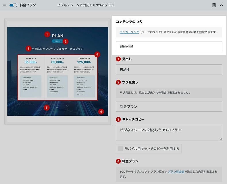 IDなので、先頭に#をつけて「#plan-list」と登録すればOKです。これでページ内リンク完了です。