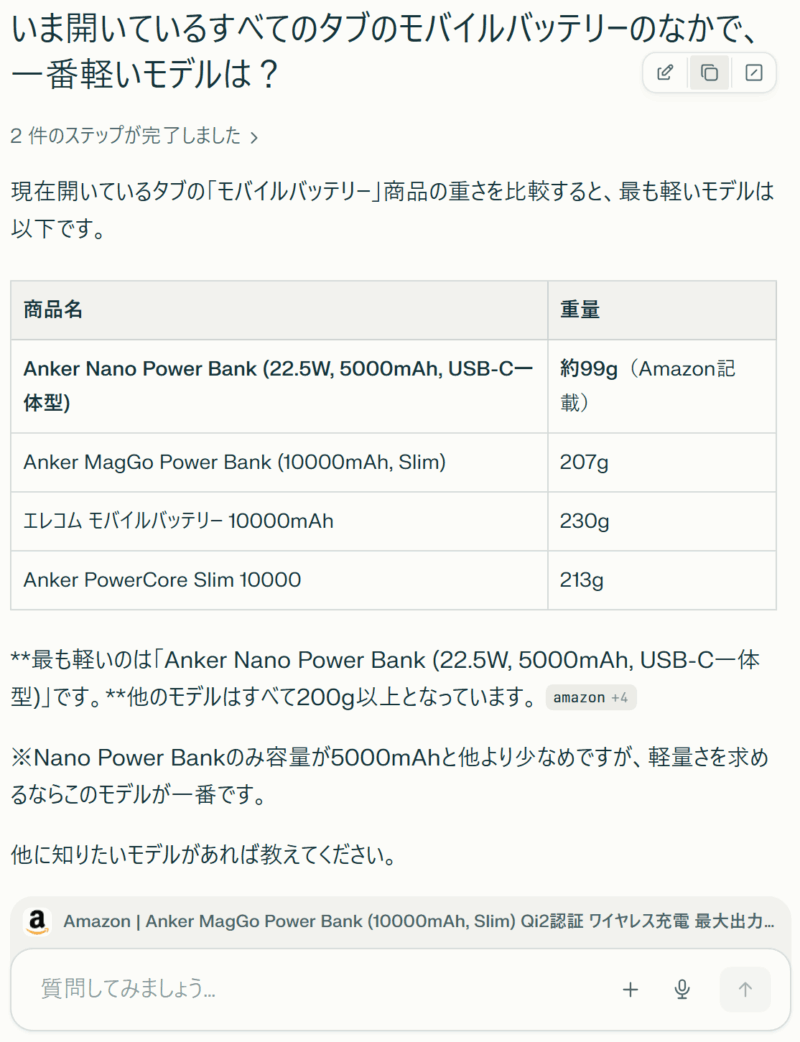 たとえば、Amazonでモバイルバッテリーの候補をいくつか別タブで開いている状態で、サイドバーのAIに以下のように指示したとします。