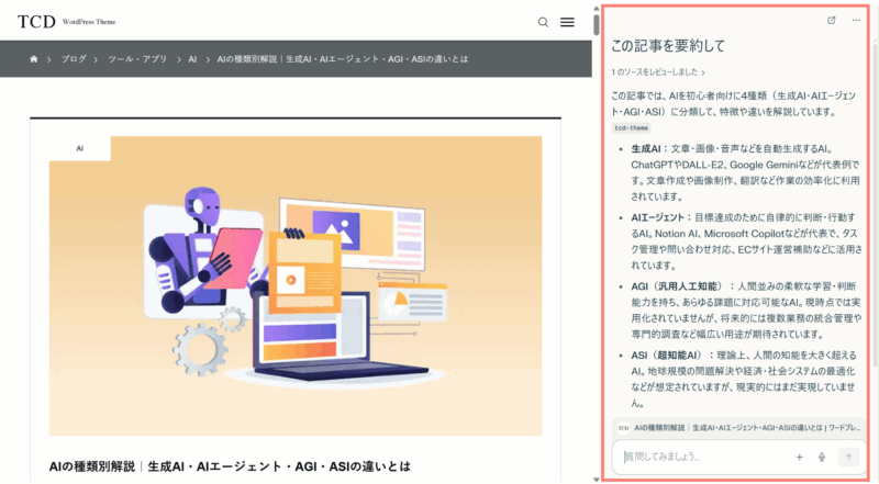 例えば、特定の記事についてAIに質問したい場合、これまではURLや本文をコピーしてチャット欄に貼り付ける手間がありました。しかしAIブラウザなら、表示中のページ内容をAIがすでに「見ている」状態にあるため、その場で即座に要約を頼んだり、質問したりできるわけです。