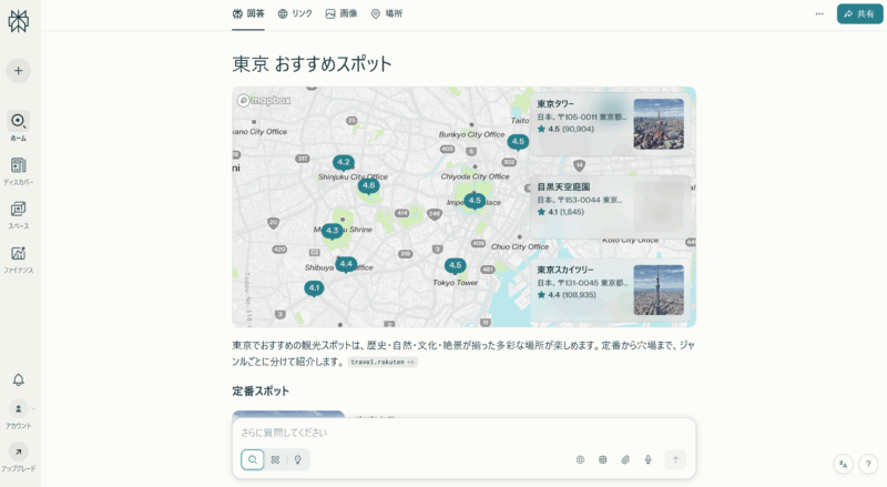 たとえば「東京 おすすめスポット」と検索した場合、AIが複数サイトの情報をリサーチして整理し、要点をまとめて返してくれるイメージです。