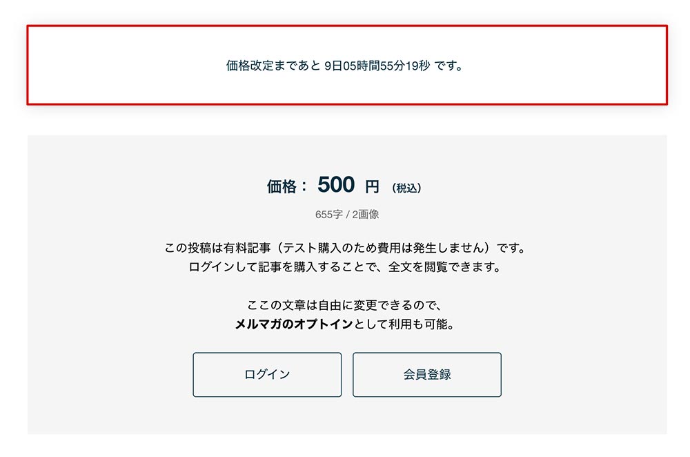 指定した日時になると、価格が自動で切り替わる仕組みです(変更後、下記赤枠箇所は非表示になります)。