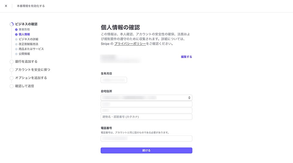 以降は、ビジネス名や、国、事業形態(個人事業主)などのビジネスの基本情報を入力していきます。