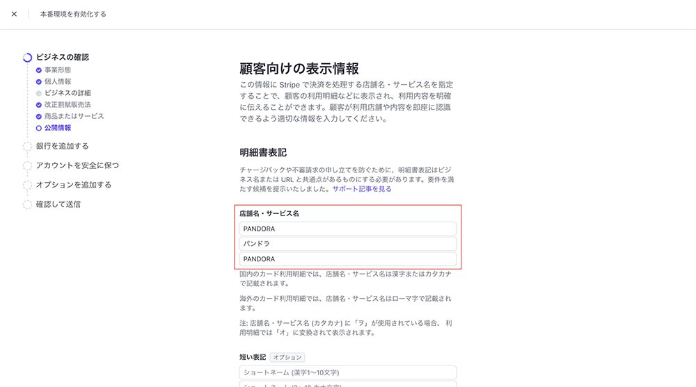 記事を購入したユーザーに届く領収書に表示される店舗名やサービス名も、このフロー内で登録します。