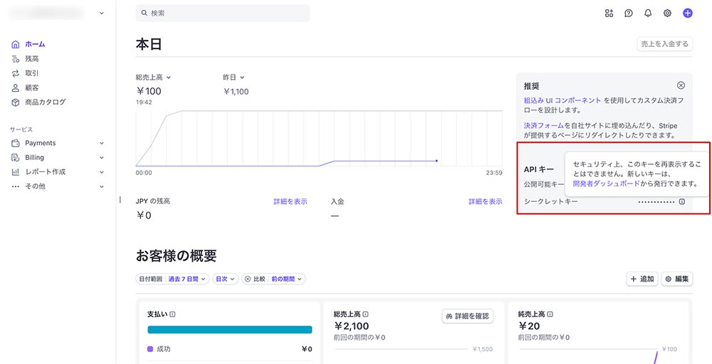 本番環境のAPIキー(シークレットキー)は、一度しか全文を表示できない仕組みになっています。後から同じキーを確認することはできません。