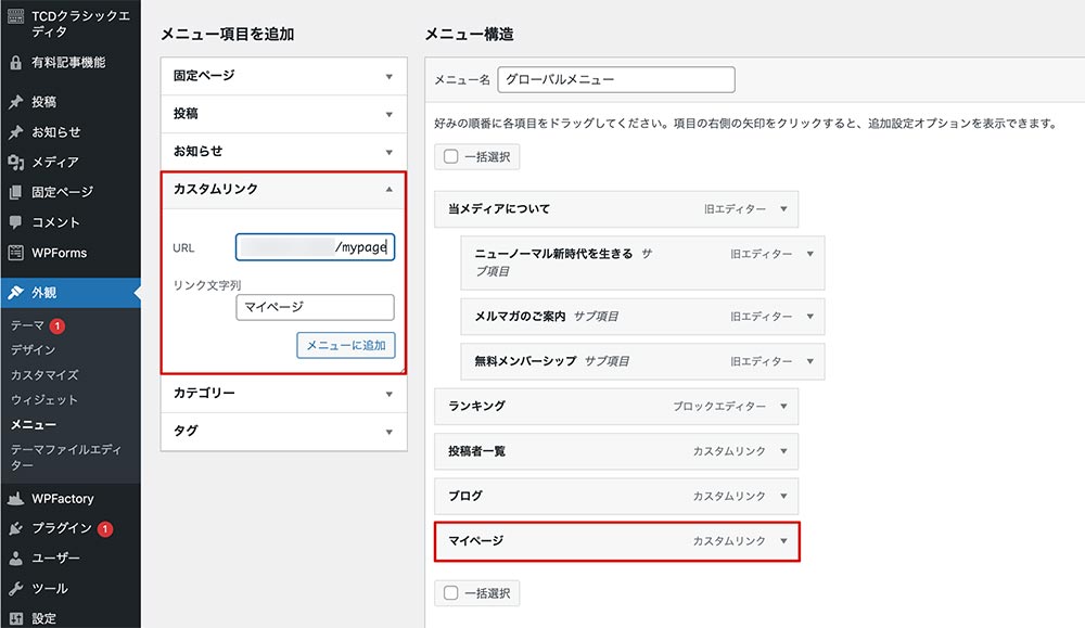生成された「マイページのURL」を、ナビメニューの項目に追加しておくといいでしょう。