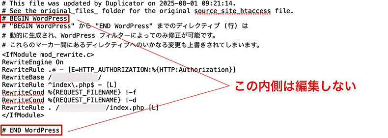 「# BEGIN WordPress」「# END WordPress」の内側は絶対に編集しない