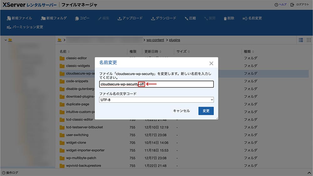 あとは、「cloudsecure-wp-security」というフォルダを探して、右クリックして「名前を変更」します。