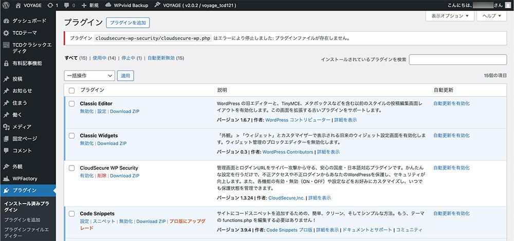 上記のようにエラーメッセージが出て、CloudSecure WP Securityが無効化されていることがわかります。不要ならば削除してしまっても大丈夫です。