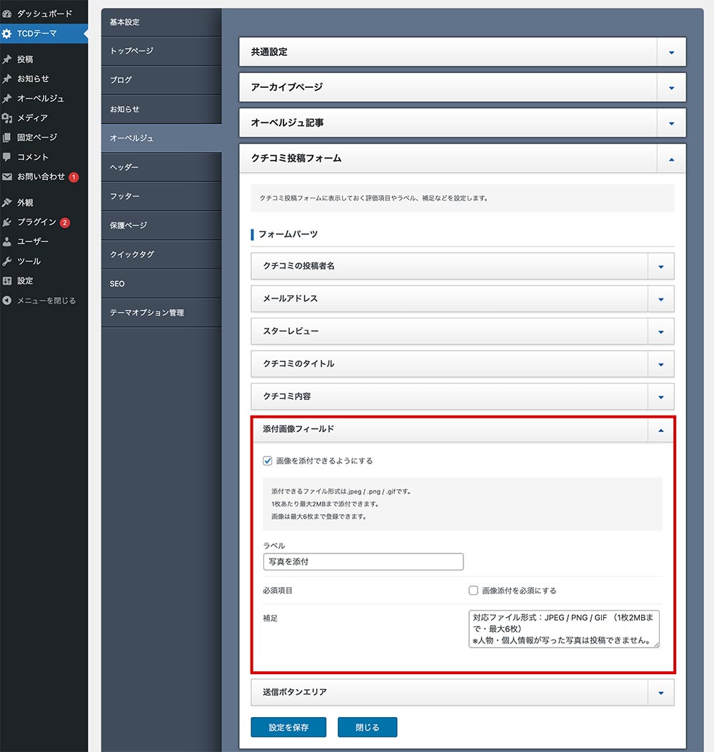 使い方はかんたんで、TCDテーマ > オーベルジュ > クチコミ投稿フォームに追加されている「添付画像フィールド」にチェックを入れるだけです。