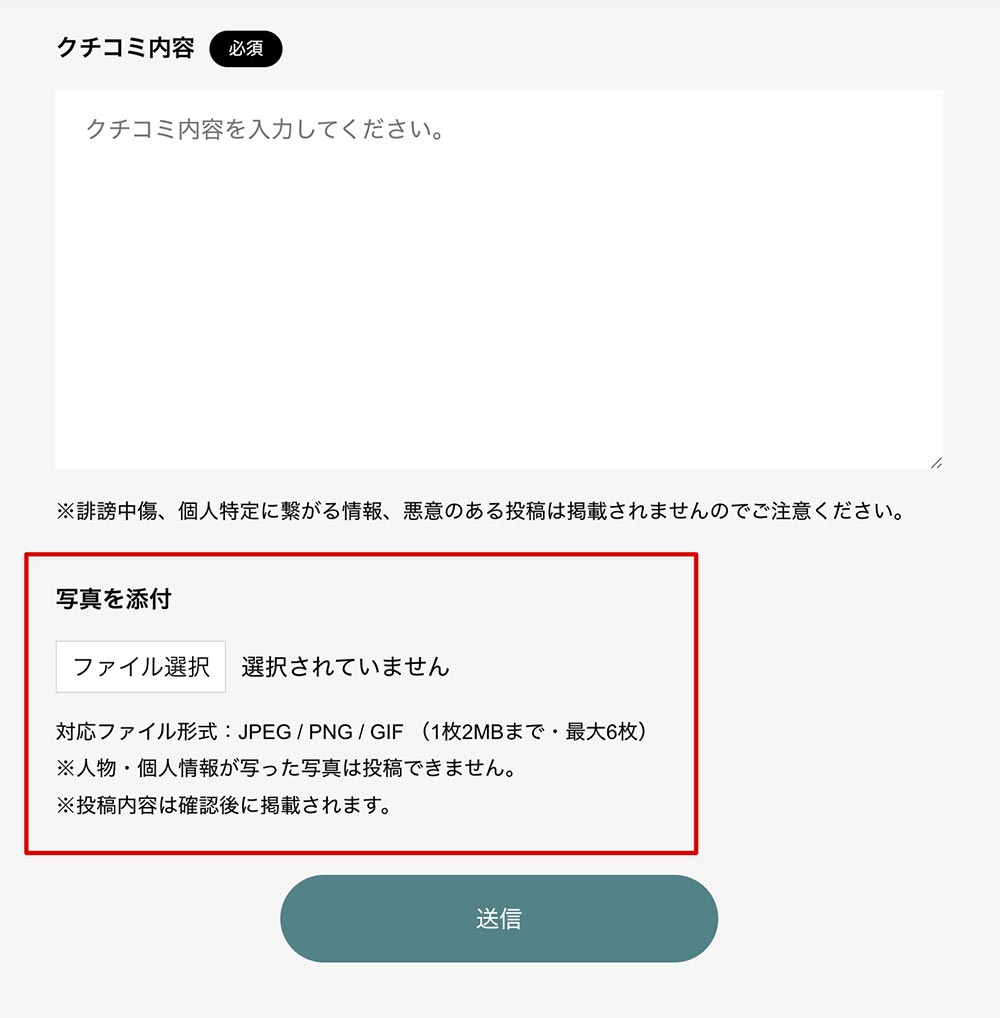 これでクチコミ投稿と同時に画像をアップロードできるようになります。1つのクチコミにつき、最大6枚までアップロード可能です。
