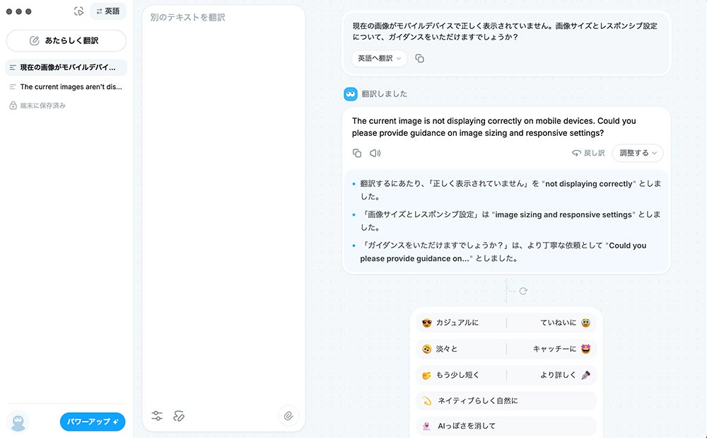 その際、文体(丁寧・カジュアル・仕事向けなど)を指定できるため、「意味は合っているが、場面に合っているか不安」というときにも便利です。
