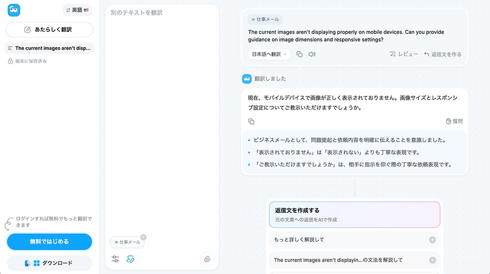 AIを使った翻訳ツールで、複数の翻訳案やニュアンスまで解説してくれます。追加指示や質問も可能です。