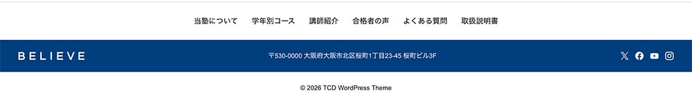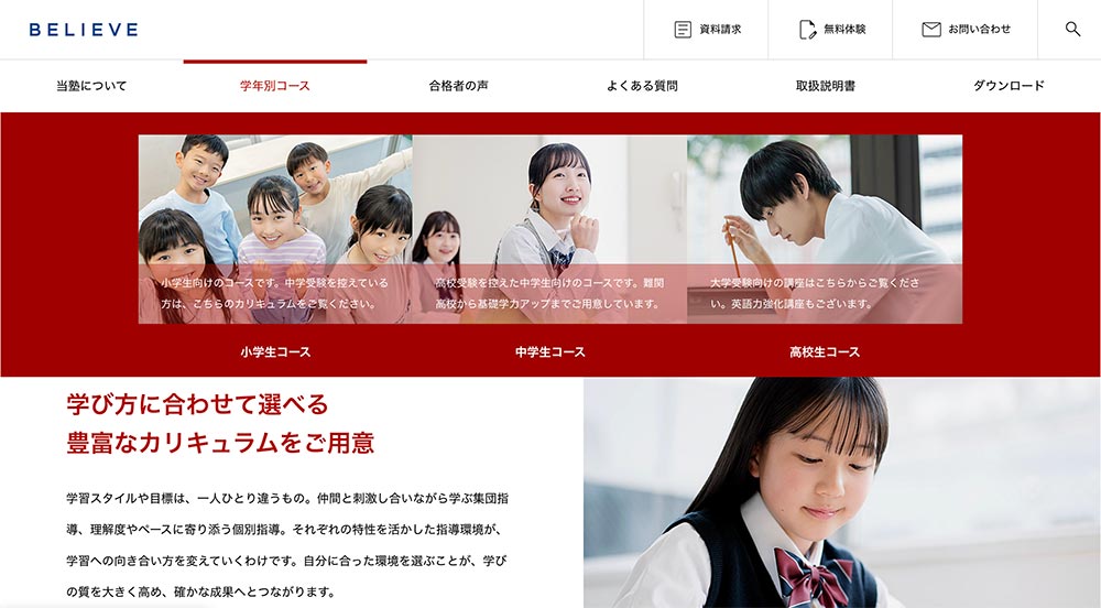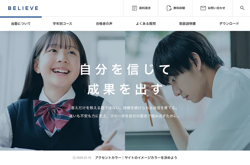 BELIEVEは、TCDシリーズ122作目のWordPressテーマで、塾や学校のホームページを構築できるテンプレートです。デモサイトでは、小中高の学年別コースを提供している学習塾をイメージしています。