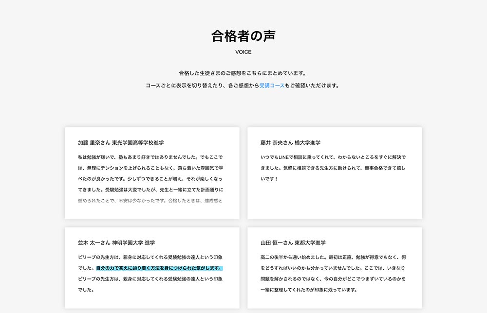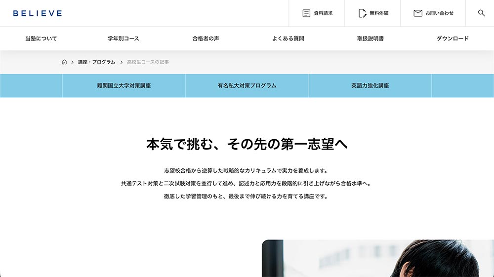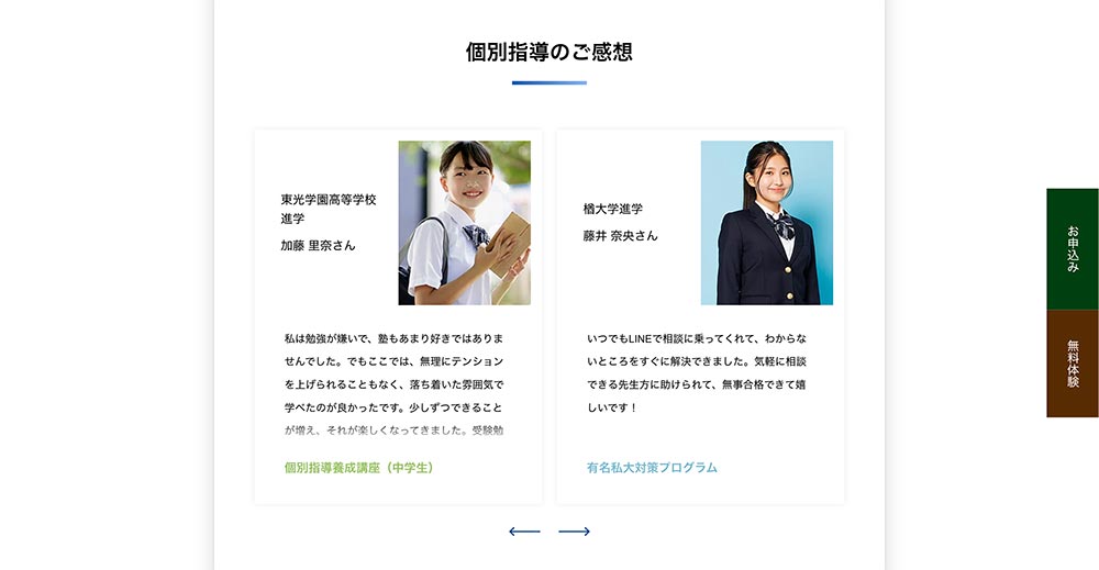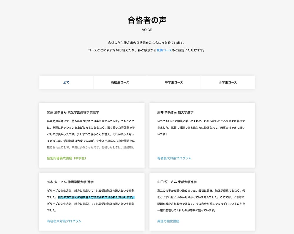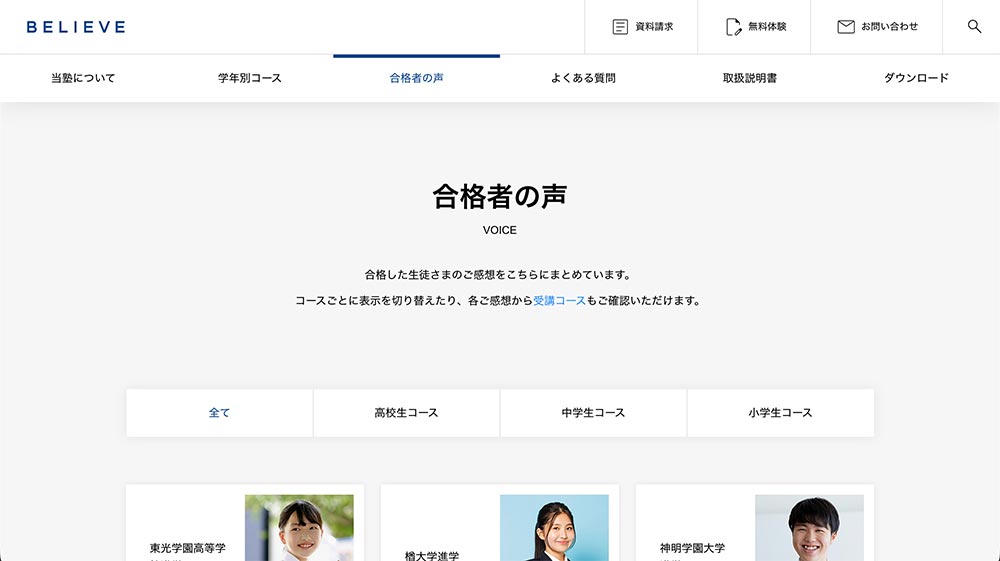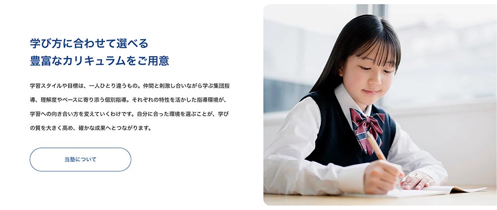 学年別コースや講座・カリキュラムの掲載、合格者の声の紹介など、教育機関向けサイトに必要な構成を備えています。