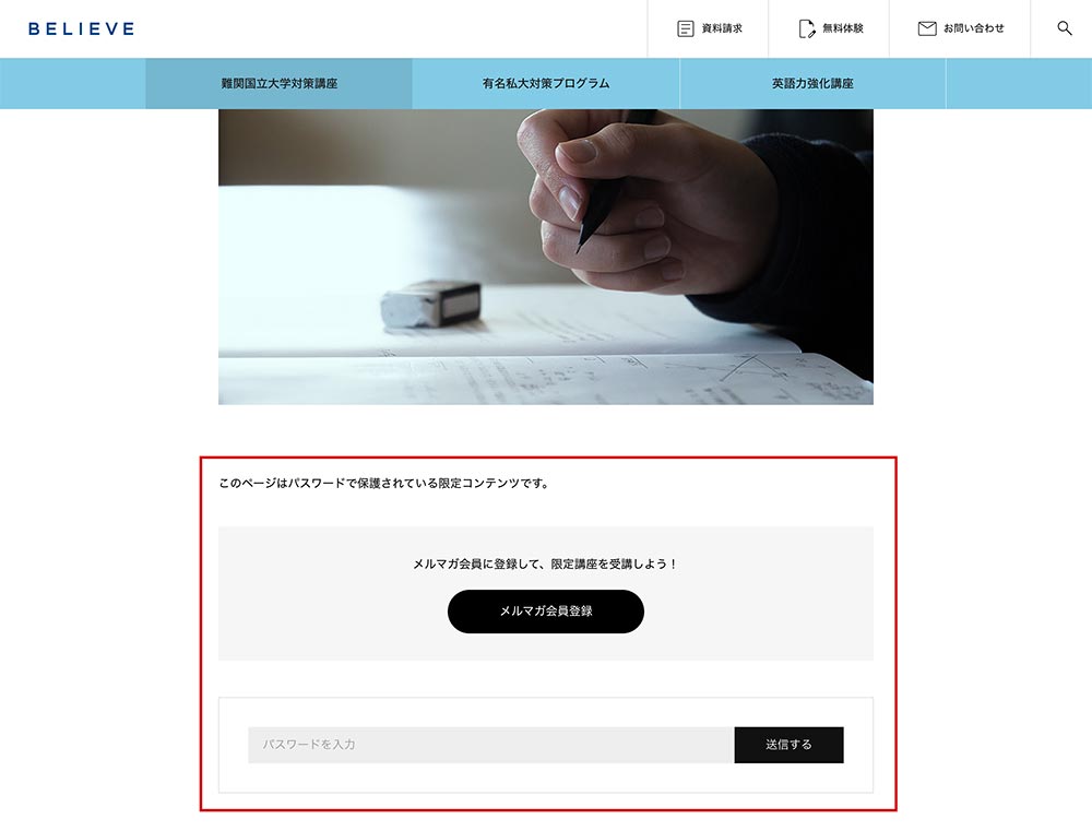 デモページの本文下部の「有名私大対策プログラム」などの箇所です。