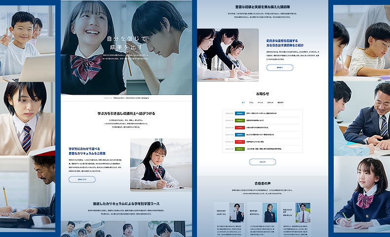 「お客様の声」や「よくある質問」など、入塾を検討する方が気になる情報も標準機能として備えています。塾だけでなく、専門学校、習い事教室、スクール型ビジネスなどにも転用可能です。