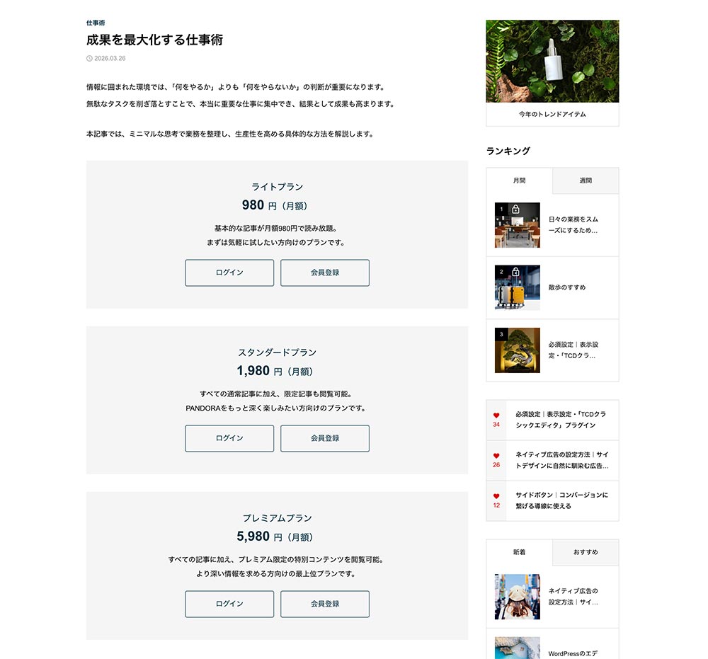 TCDテーマの有料記事機能を使えば、記事の単品販売だけでなく、定期購読(サブスクリプション)による継続的な収益化が可能になります。