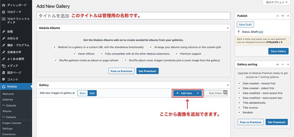 プラグインを有効化したら、ダッシュボードに追加された「Modula」をクリックして、「Add New Gallery」から新規作成します。