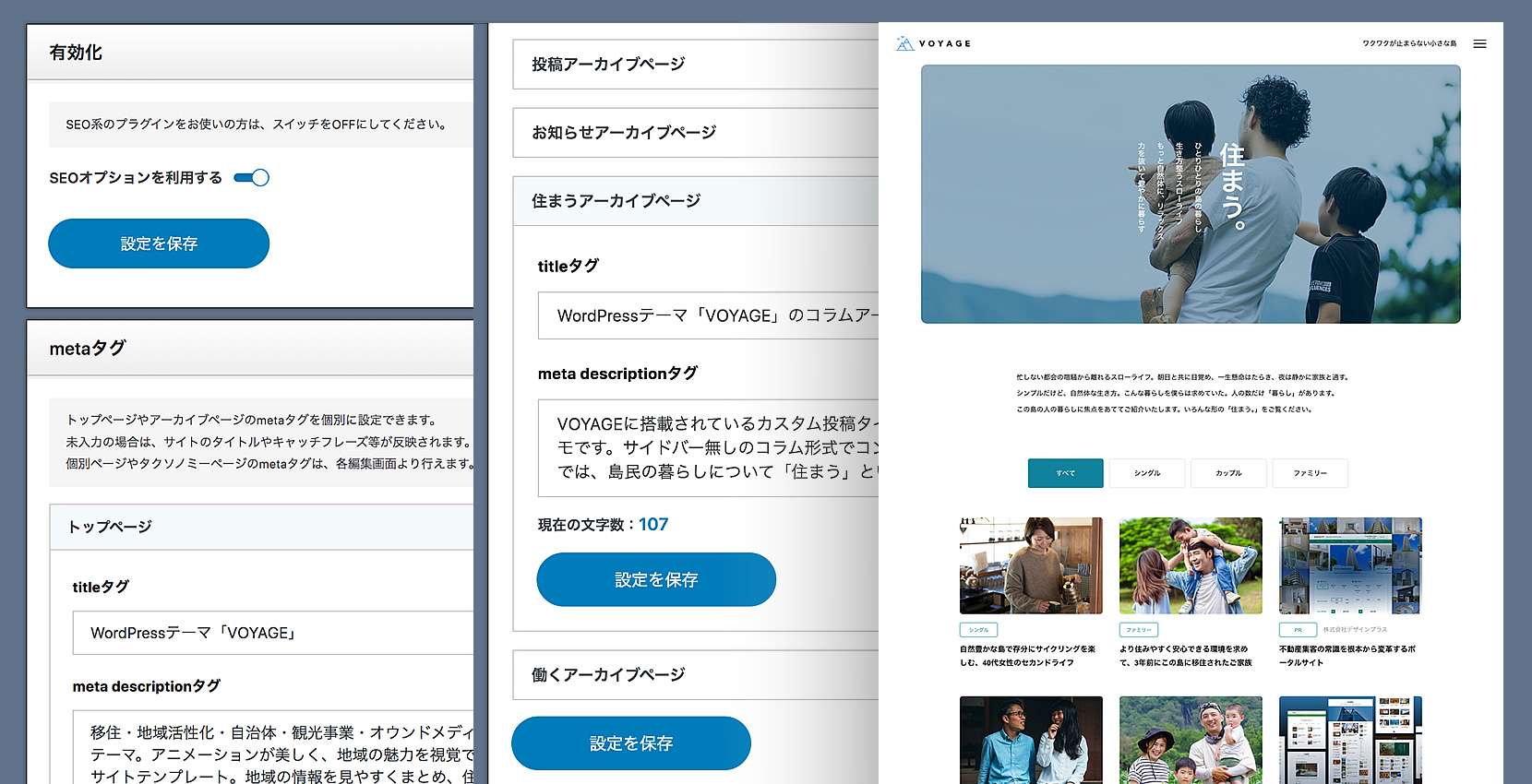 ですが、WordPressテーマ側でも多少なりとも検索結果上昇に貢献することができます。VOYAGEでは、少なからずそのお役に立てるよう、テーマ側でできることは全て可能です。